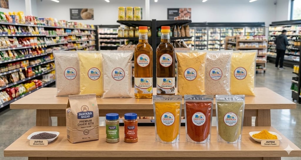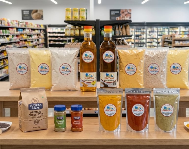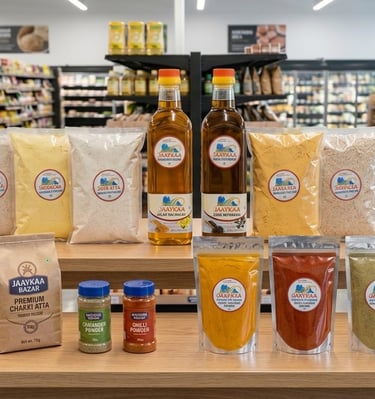 JAAYKAA BAZAR is a trusted departmental store in Lucknow offering more than 8000+ products for daily household needs. We manufacture our own 100% pure and homemade products including atta, cold-pressed oil, and spices.